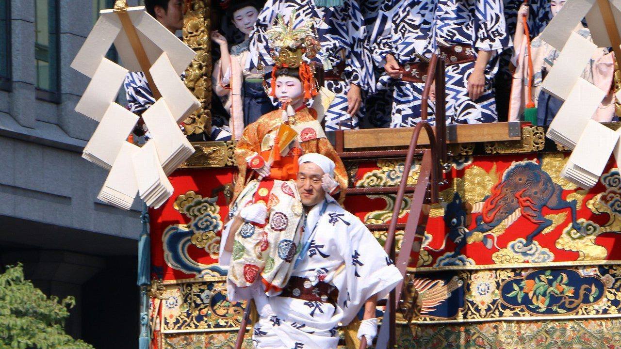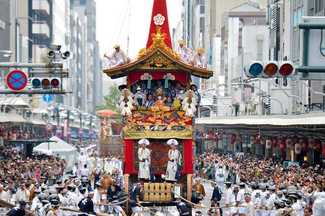 一樣被人譽為日本三大祭之一,祇園祭也擁有了一千多年的歷史,祭典中的最高潮為「山鉾巡行」,在遊行當中可以看到精緻華麗的各式花車,人們會拉著山鉾(指神祇所乘坐的山車、鉾車)沿著京都主要街道巡行,而山鉾上的裝飾會利用民間流傳的故事或趣聞為主題,發揮創意將山鉾改造得絢麗無比。拉著山鉾的人們也會搭配著山鉾佈置的主題,穿上不同的日本傳統服飾,可以說祇園祭能一覽許多日本民間故事和神話,因此有「活動美術館」的美譽。