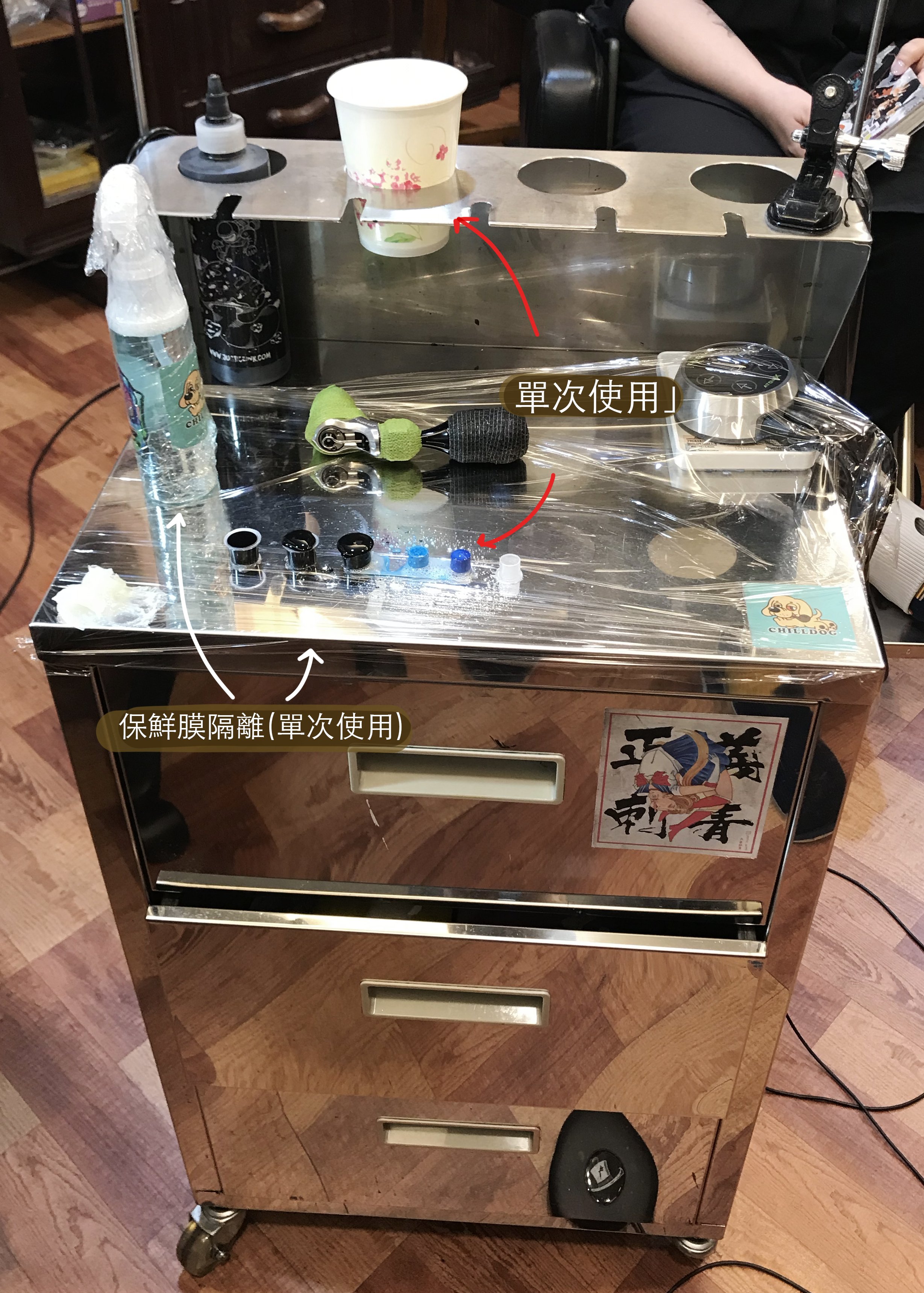 刺青時會需要用到的藍皂噴灌和線材、機器的機身、工作台車的檯面,都會使用保護措施包好,